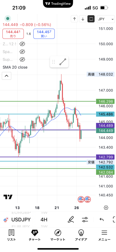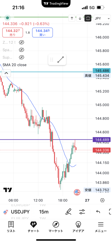 そんな中144.4円台まで切り返してきたのでロング。根拠はファンダの割には落ちる速度が早かったので調整も大きいのではということだけだ。こちらも低ロット。どうなることやら。