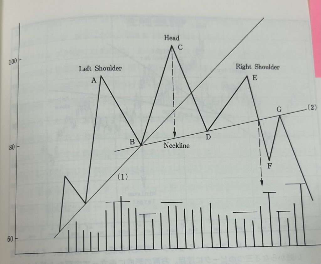 ②取引量を伴って左肩が形成され、次に調整的な下落が起こる。