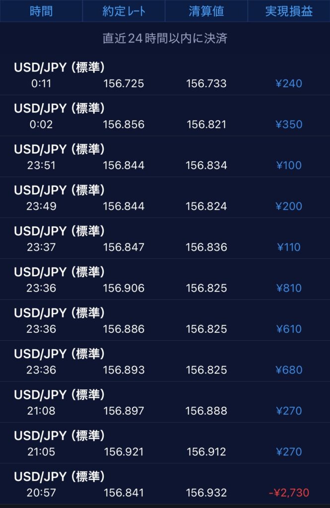 21時ー24時でドル円のスキャルピング。156.7〜157.0の間で1時間足はレンジで推移しておりポラリティは低かった。